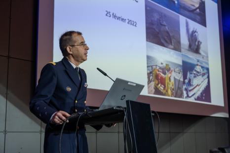 Le Vice-Amiral d'Escadre Philippe Dutrieux, Commandant la zone maritime Manche-mer du Nord, Commandant l'arrondissement maritime de Cherbourg, Préfet maritime de la Manche et de la mer du Nord a présenté les enjeux maritimes en Manche, mer du Nord, et est revenu entre autres, sur la question du Brexit, des migrants et de l’éolienne en mer.